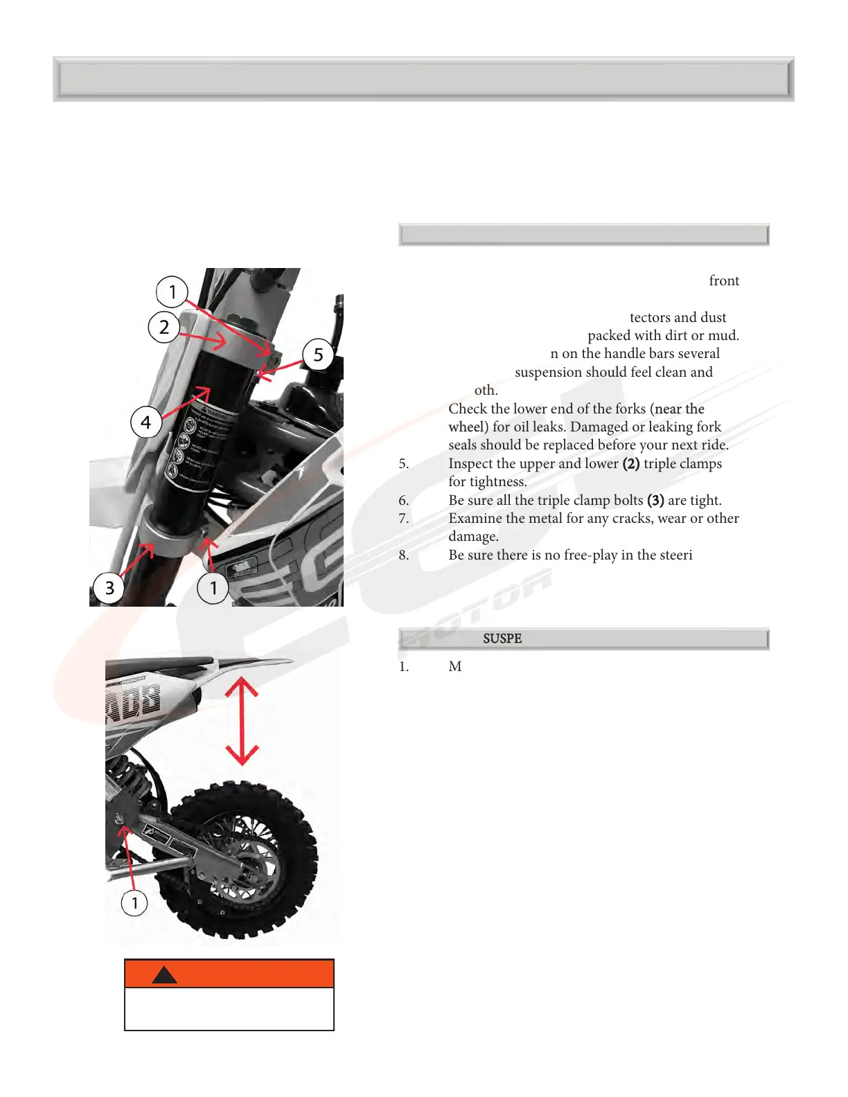 Loose, worn or damaged suspension components may aect the stability and handling of your motorcycle. If
