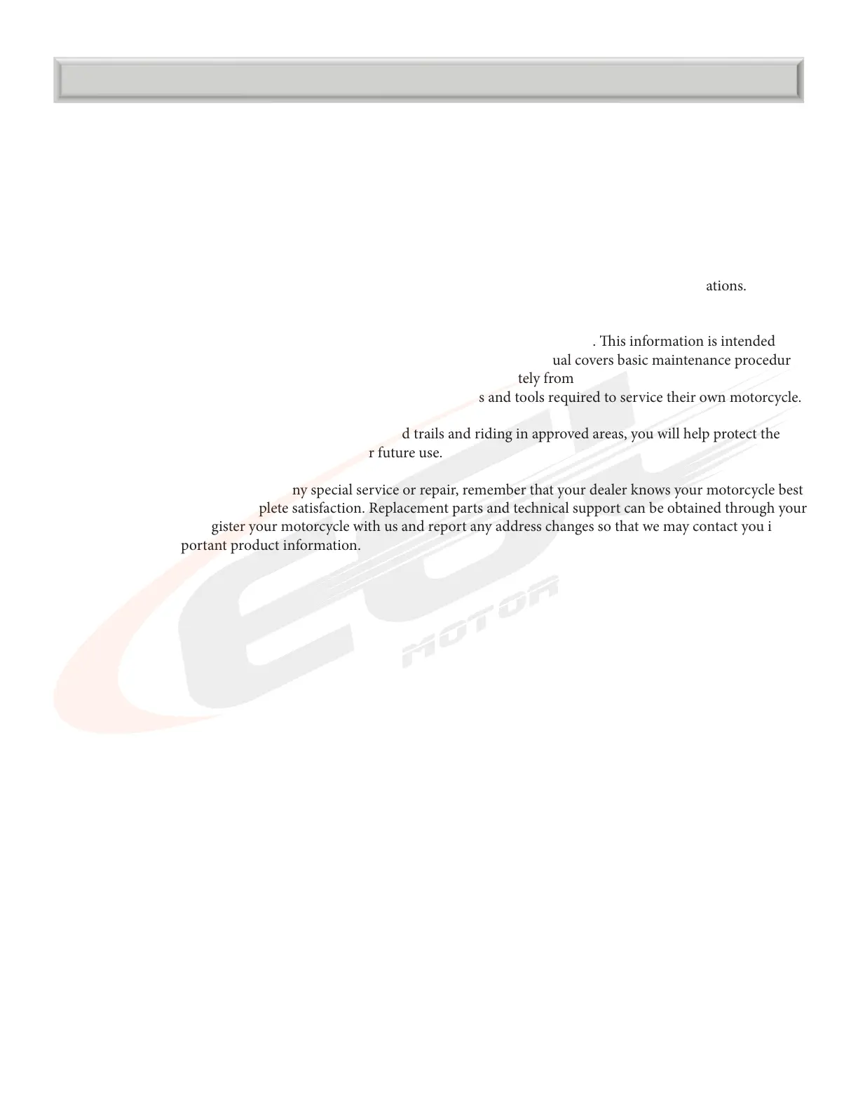 Congratulations on choosing your EGL MotorEGL Motor o-road motorcycle.