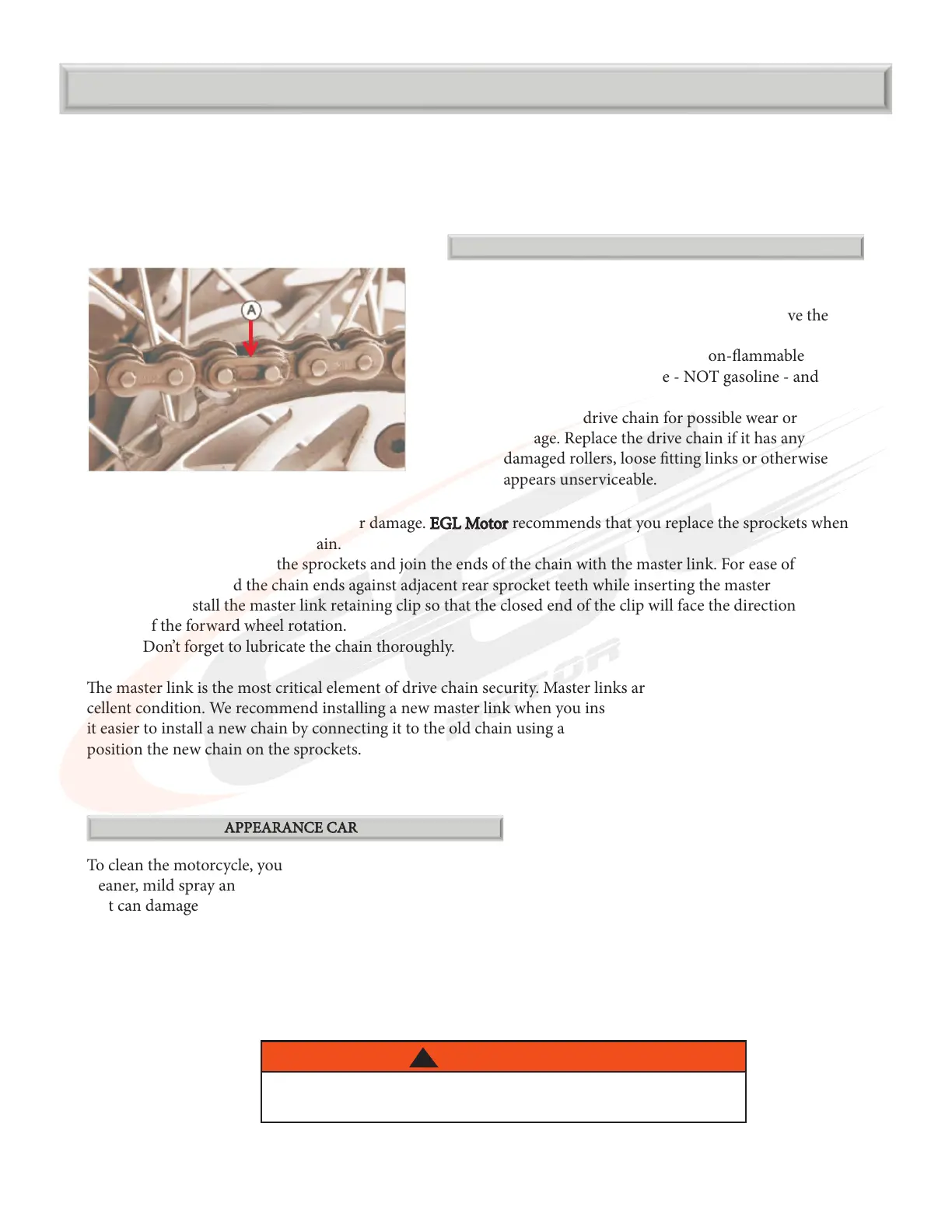 4. Inspect the sprockets for wear or damage. EGL MotorEGL Motor recommends that you replace the sprockets when