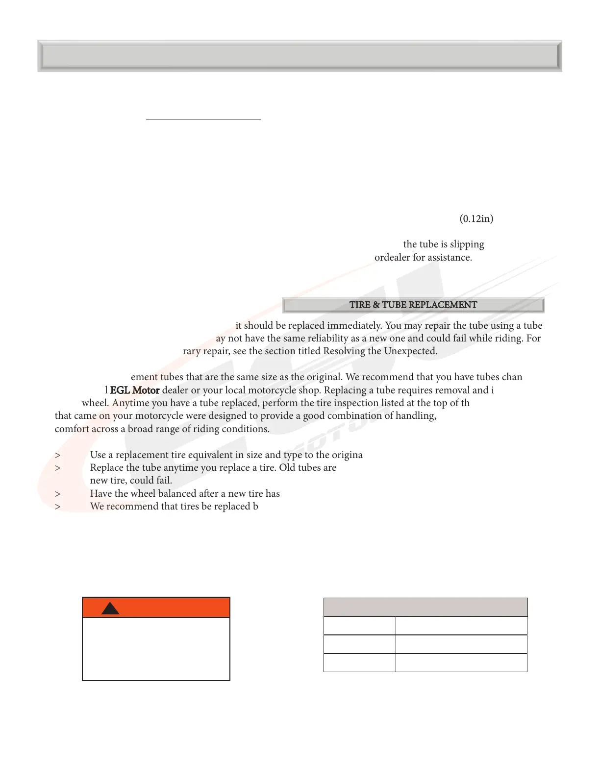 > We recommend that tires be replaced by your EGL MotorEGL Motor dealer or a local motorcycle shop.