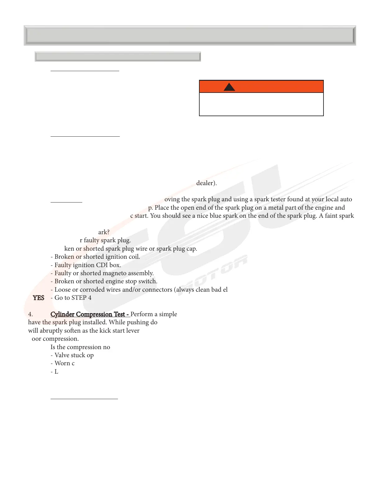 4. Cylinder Compression Test - Cylinder Compression Test - Perform a simple compression test by kick starting the engine slowly. Be sure you