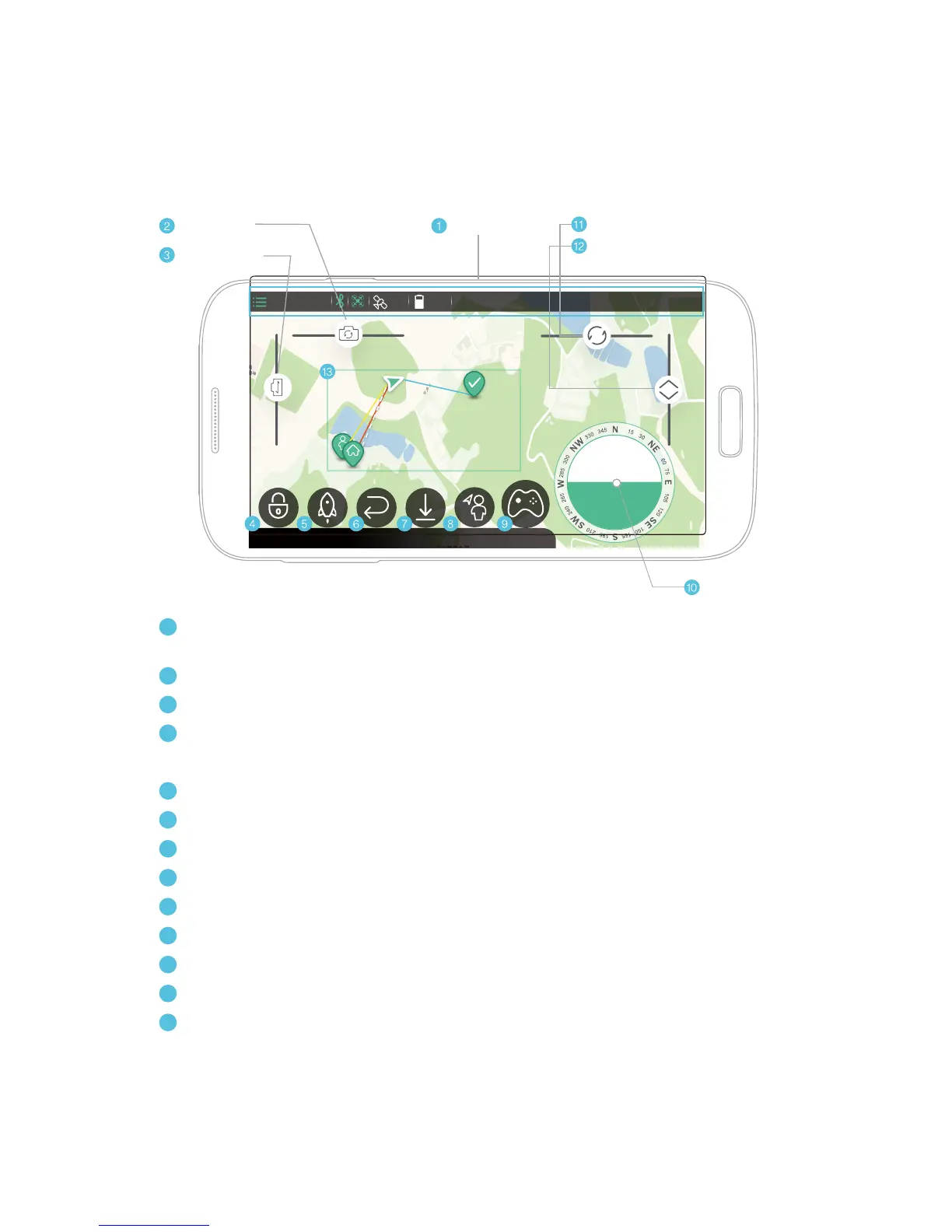 Status Bar: Settings, Flight mode, Bluetooth, “Heartbeat”, Number of Satellites,
