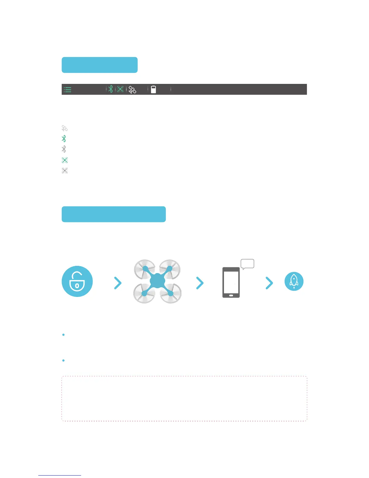 From left to right: Settings, Flight mode, Bluetooth, “Heartbeat”, Number of Satellites,