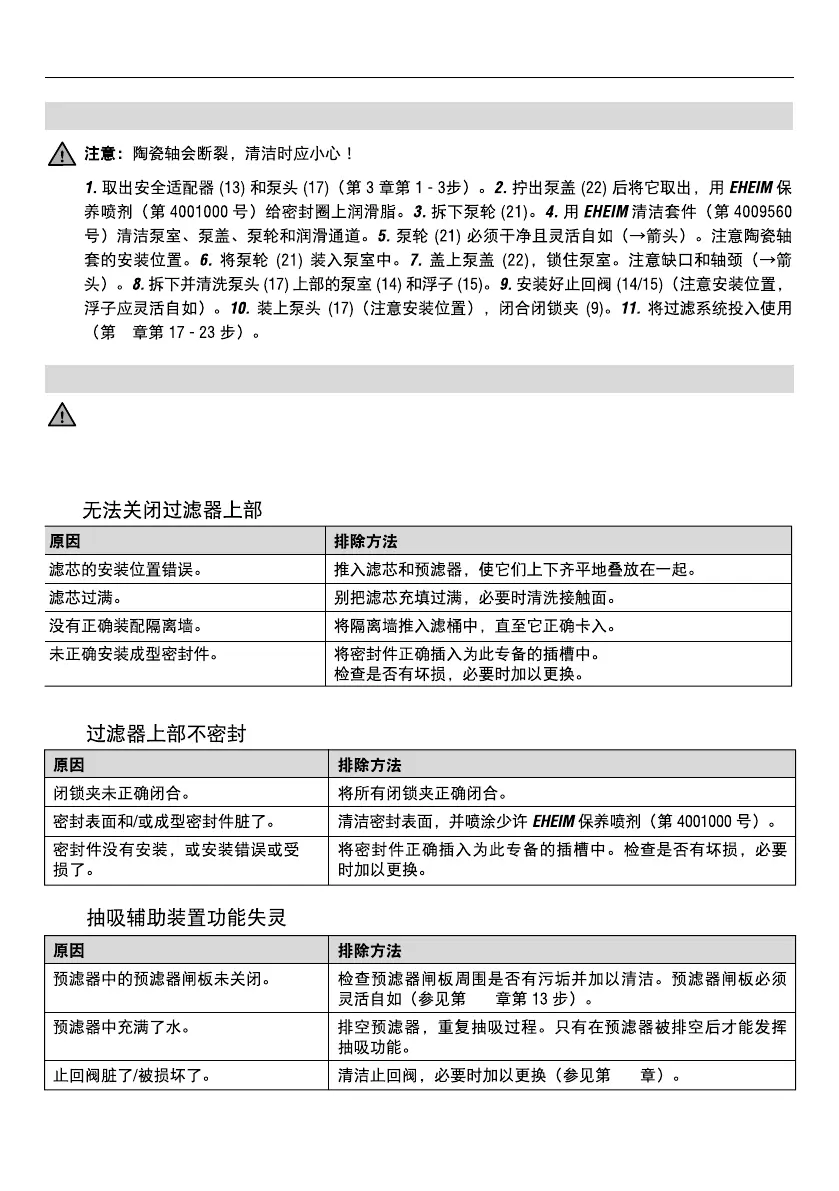 在过滤器上工作时,要确保没有水进入电气接口。拔掉电源插头! 如果出现问题,请到我们的网站www.eheim.com,或拨打服务