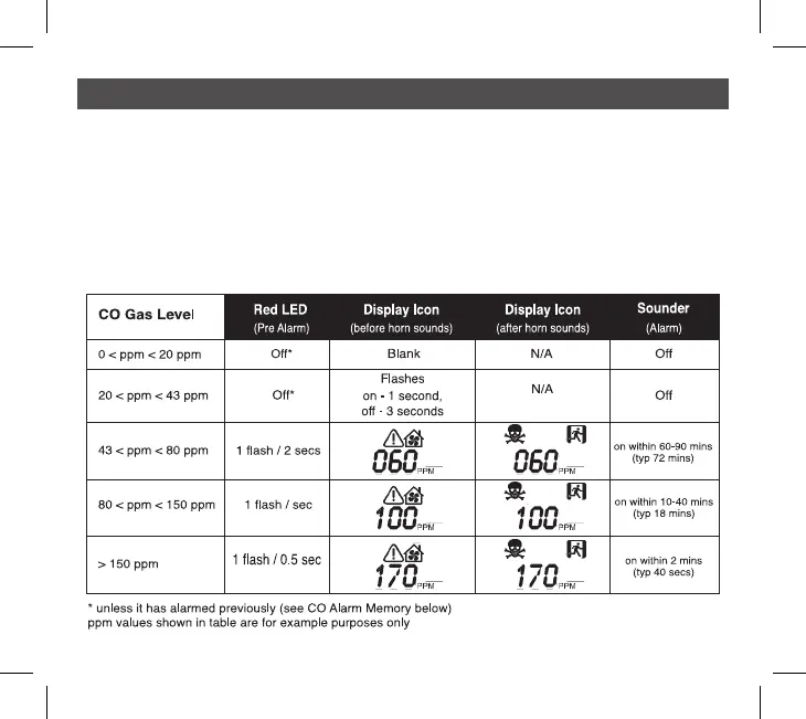 levels of CO the CO Alarm will sound quicker. The rate of flashing of the red light indicates