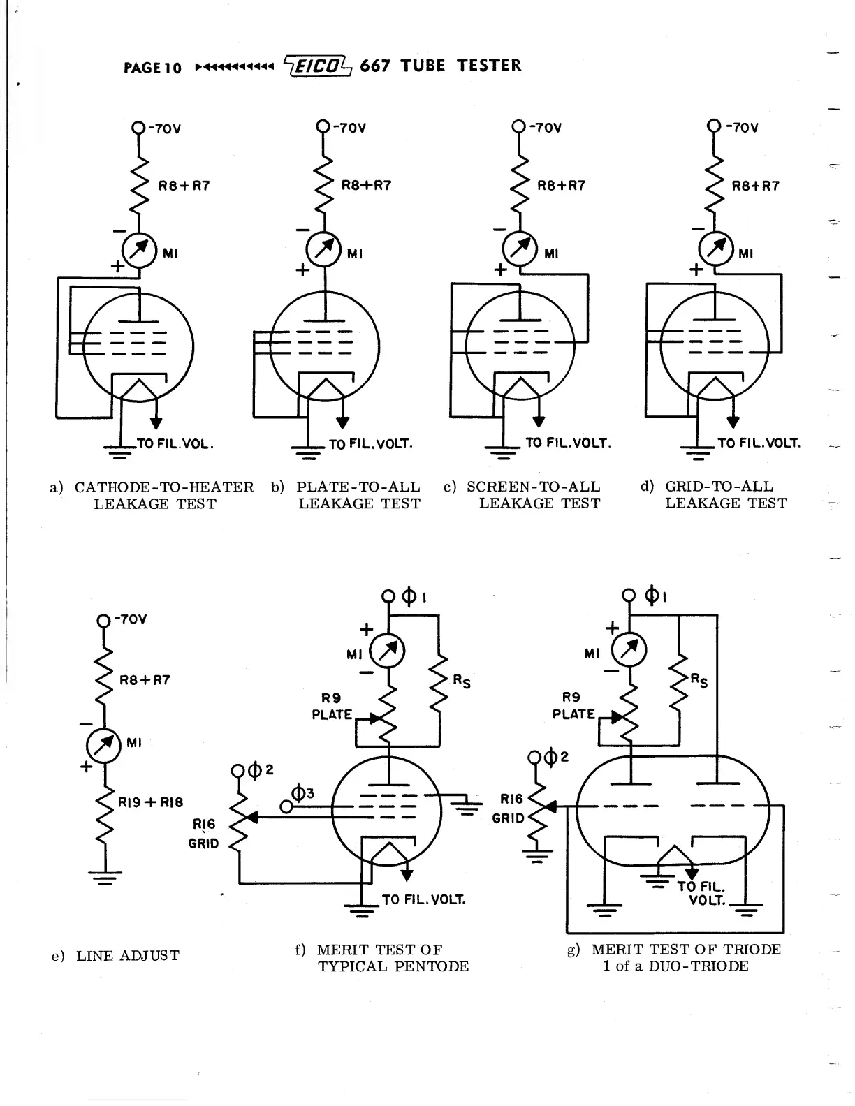 Eico 667 - SCHEMATIC DIAGRAMS; Leakage Test Schematics; Adjustment and Pentode;Triode Merit Schematics