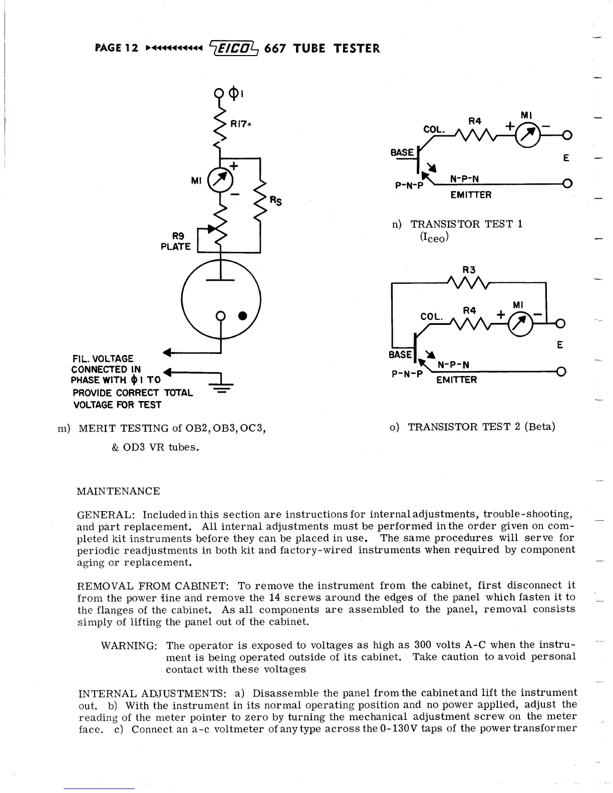 Eico 667 - SCHEMATIC DIAGRAMS (Continued); VR Tube and Transistor Test Schematics; MAINTENANCE; Cabinet Removal Procedure