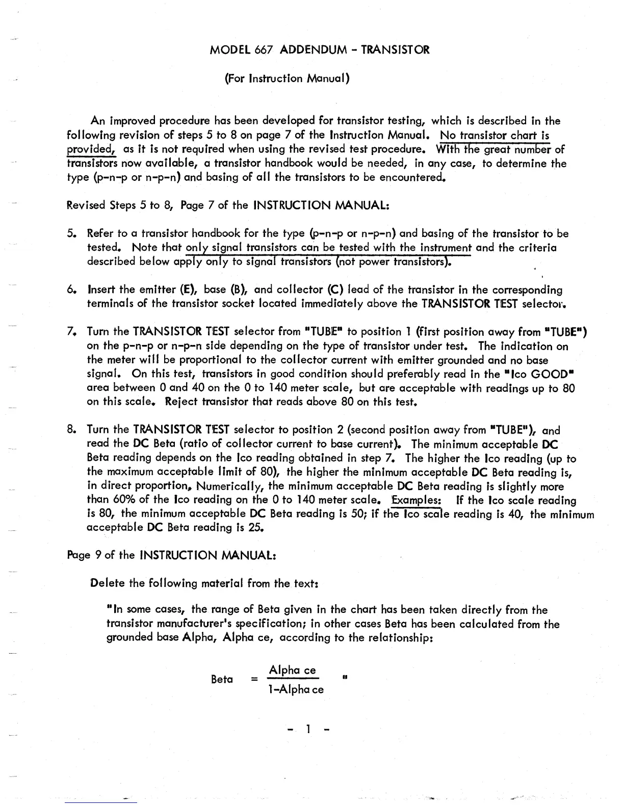 Eico 667 - MODEL 667 ADDENDUM - TRANSISTOR; Revised Transistor Test Procedure; Text Deletion Notice