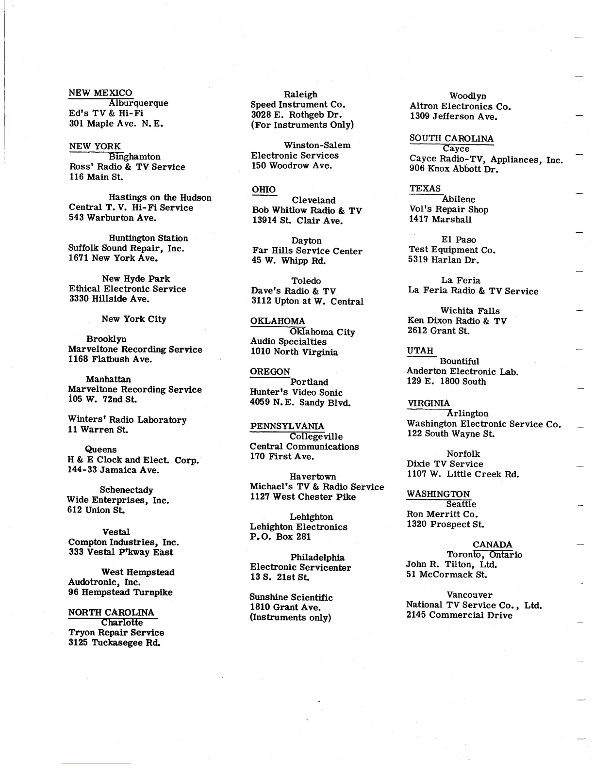 Eico 667 - AUTHORIZED WARRANTY SERVICE AGENCIES (Continued); Service Agencies by State and Canada