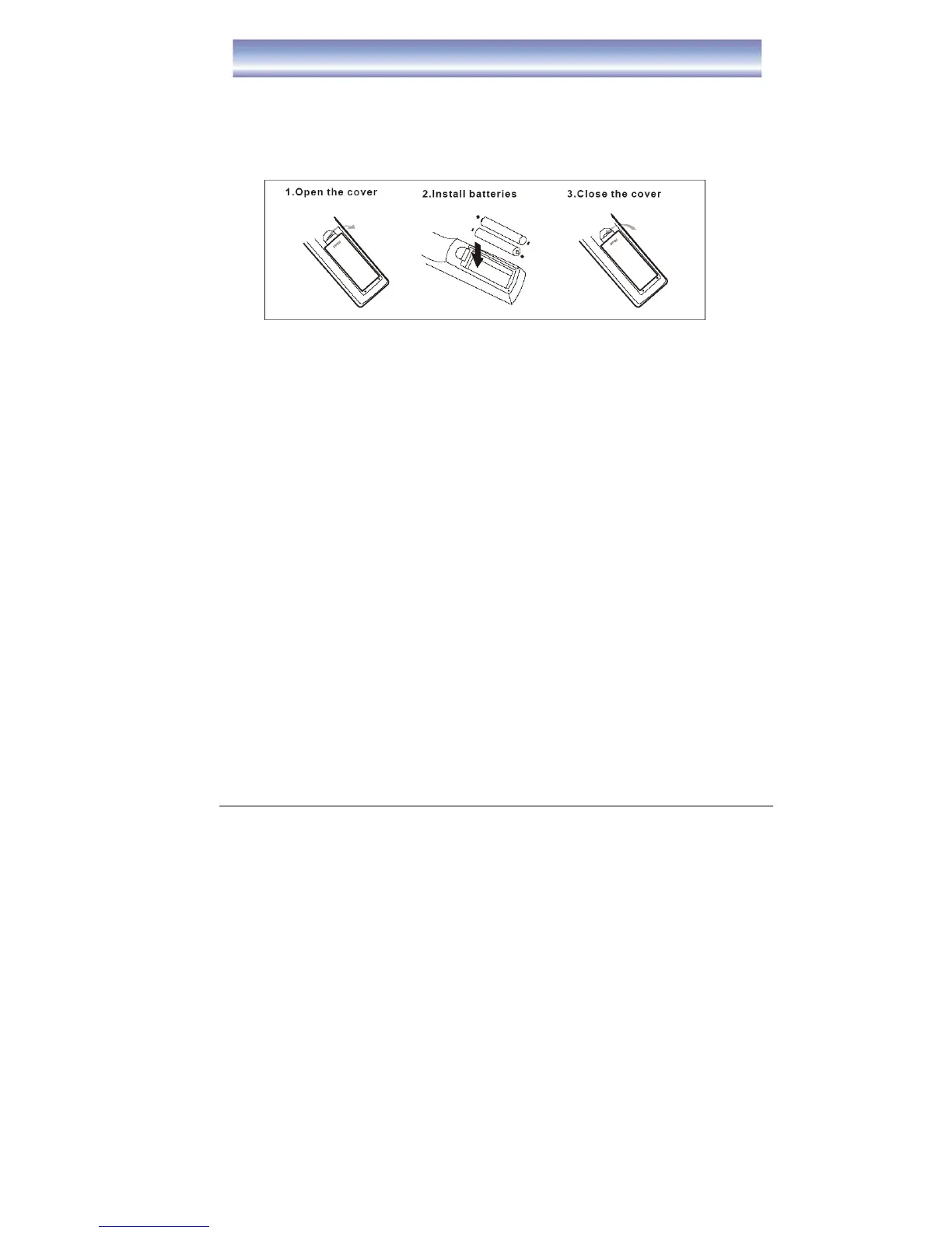 將遙控器後的電池蓋取下, 然後將2枚AAA電池放入裏面。