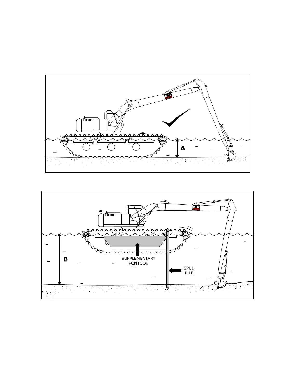 figure 1.18 illustrates an amphibious excavator operates at water depth B with supplementary