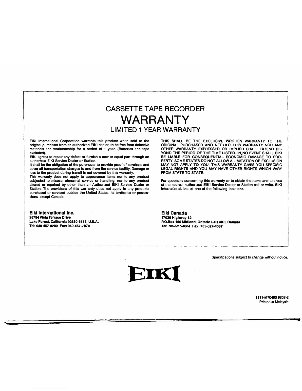 EIKI International Corporation warrants this product when sold to the