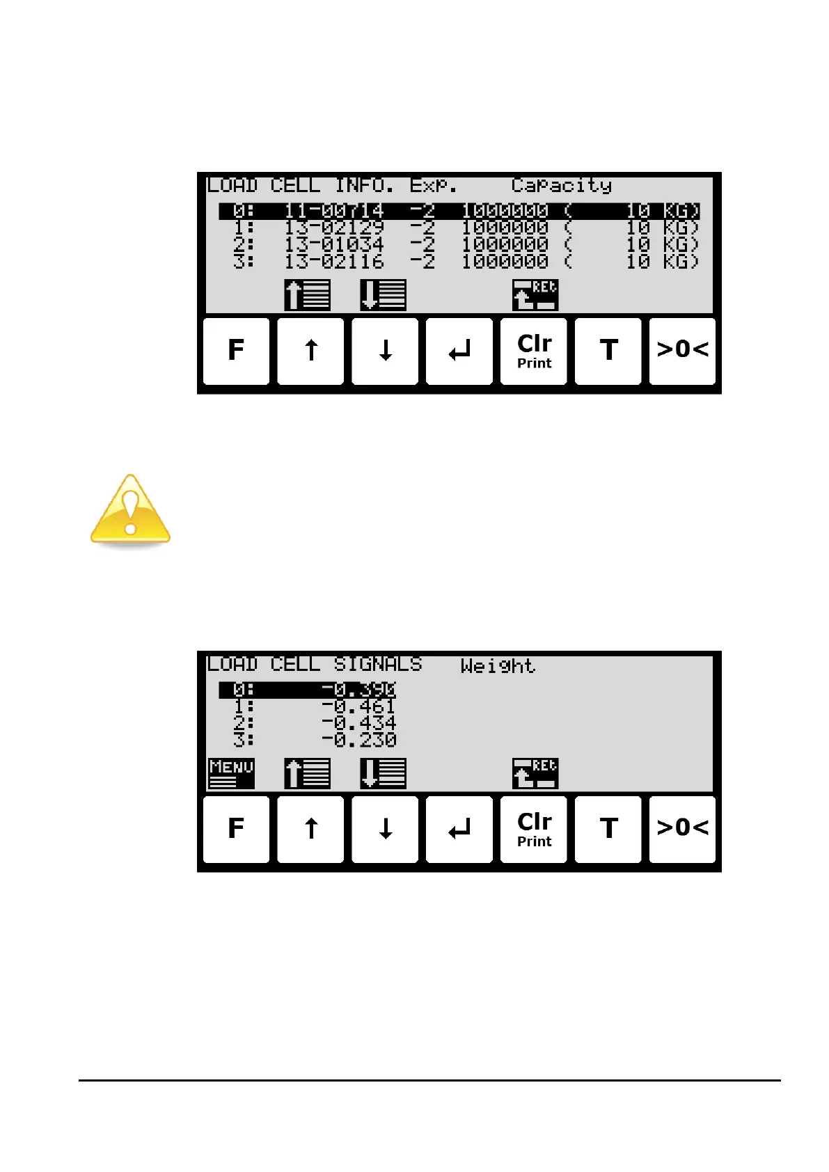In the LOAD CELL SIGNALS screen, the individual load cell readings can be checked: