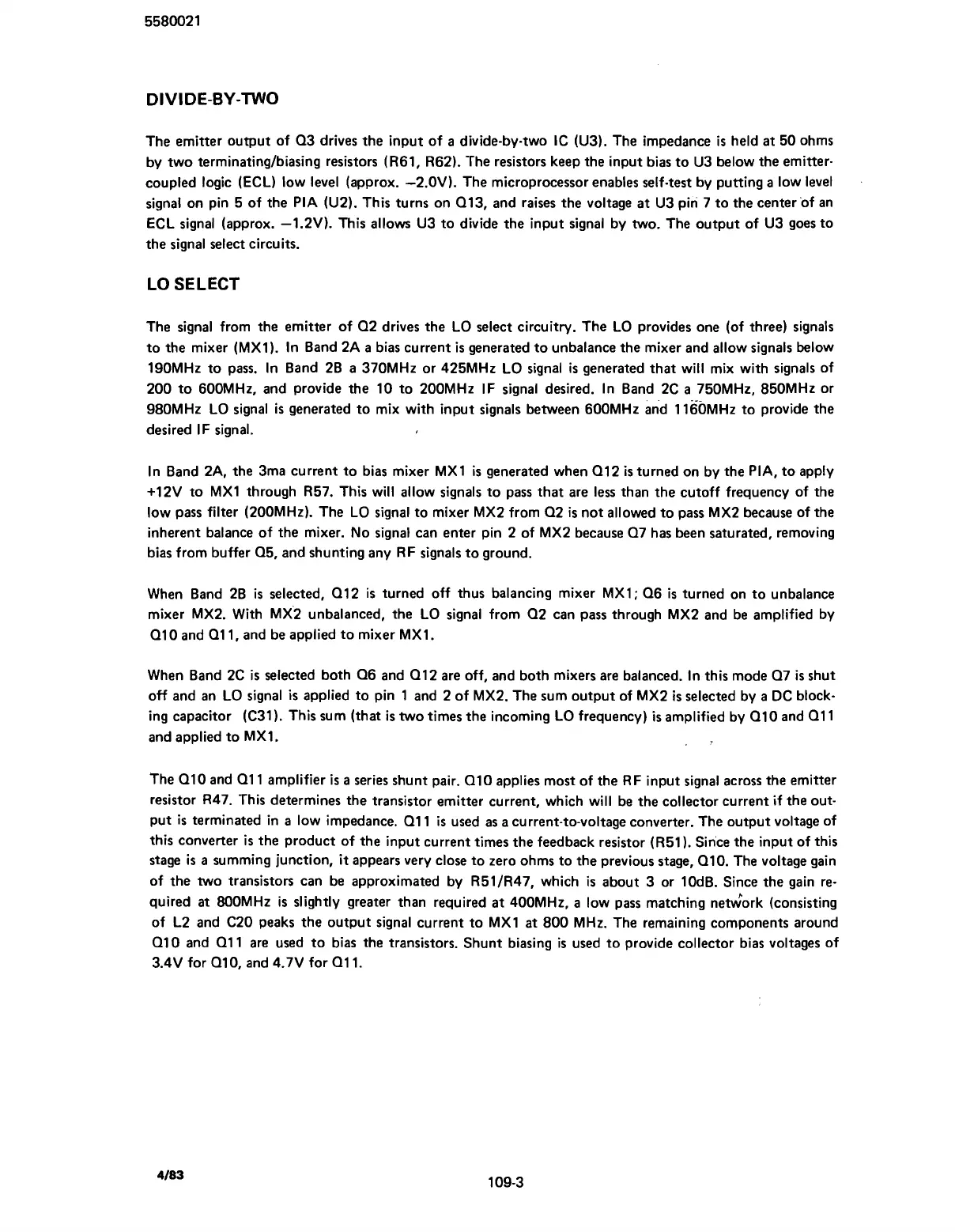 The signal from the emitter of Q2 drives the LO select circuitv. The LO provides one (of three) signals