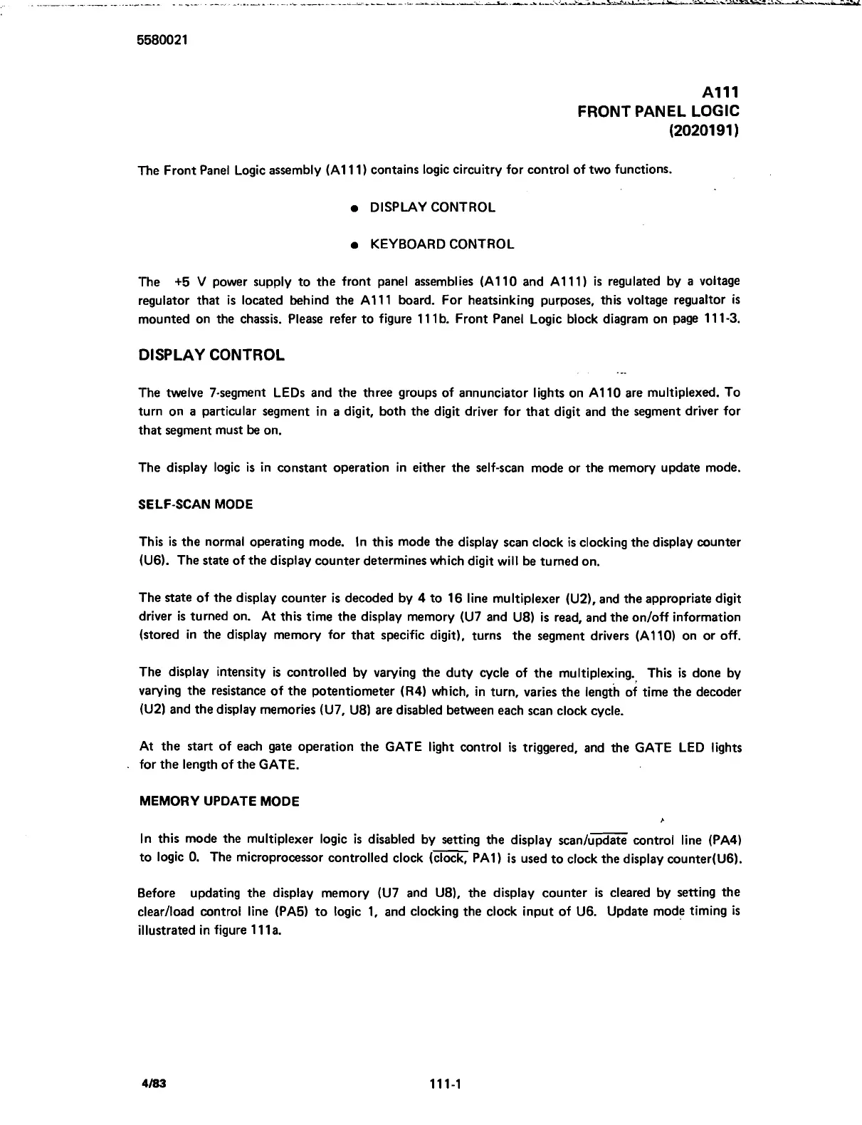 The Front Panel Logic assembly (A1 11) contains logic circuitry for control of two functions.