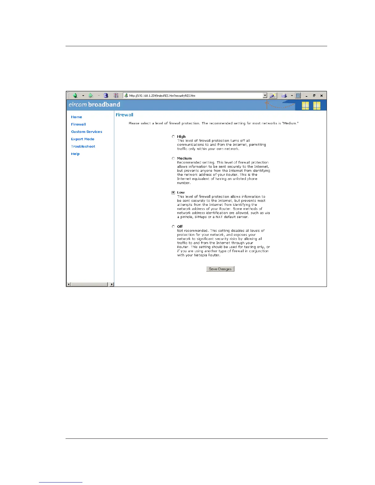 Set the level of firewall protection to LOW and press the button ‘Save Changes’.