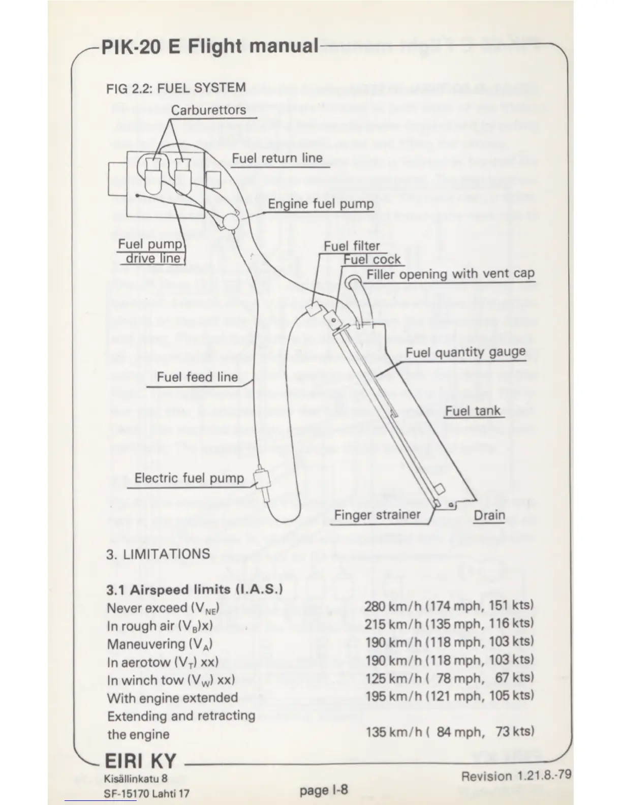 Eiri KY PIK-20 E - Fuel System; Airspeed Limits; Limitations