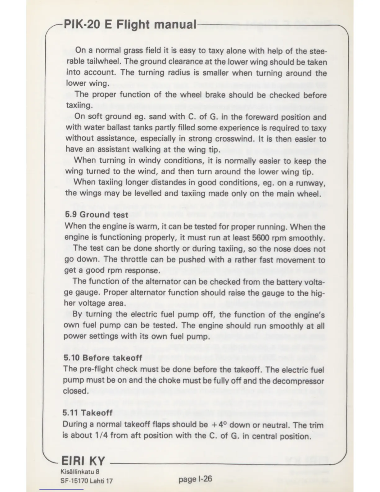Eiri KY PIK-20 E - Ground Test; Before Takeoff; Takeoff