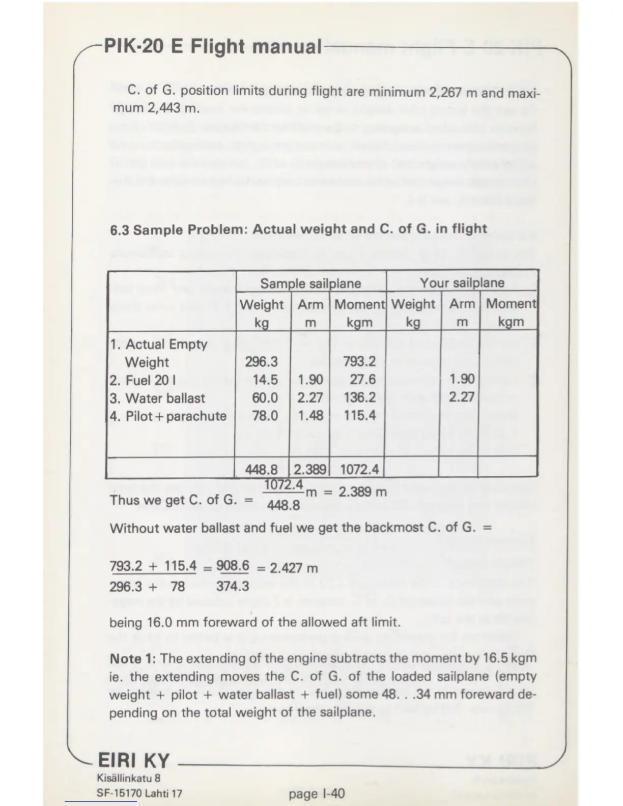Eiri KY PIK-20 E - Eiri Ky; Sample Problem: Actual Weight and C. of G. in Flight