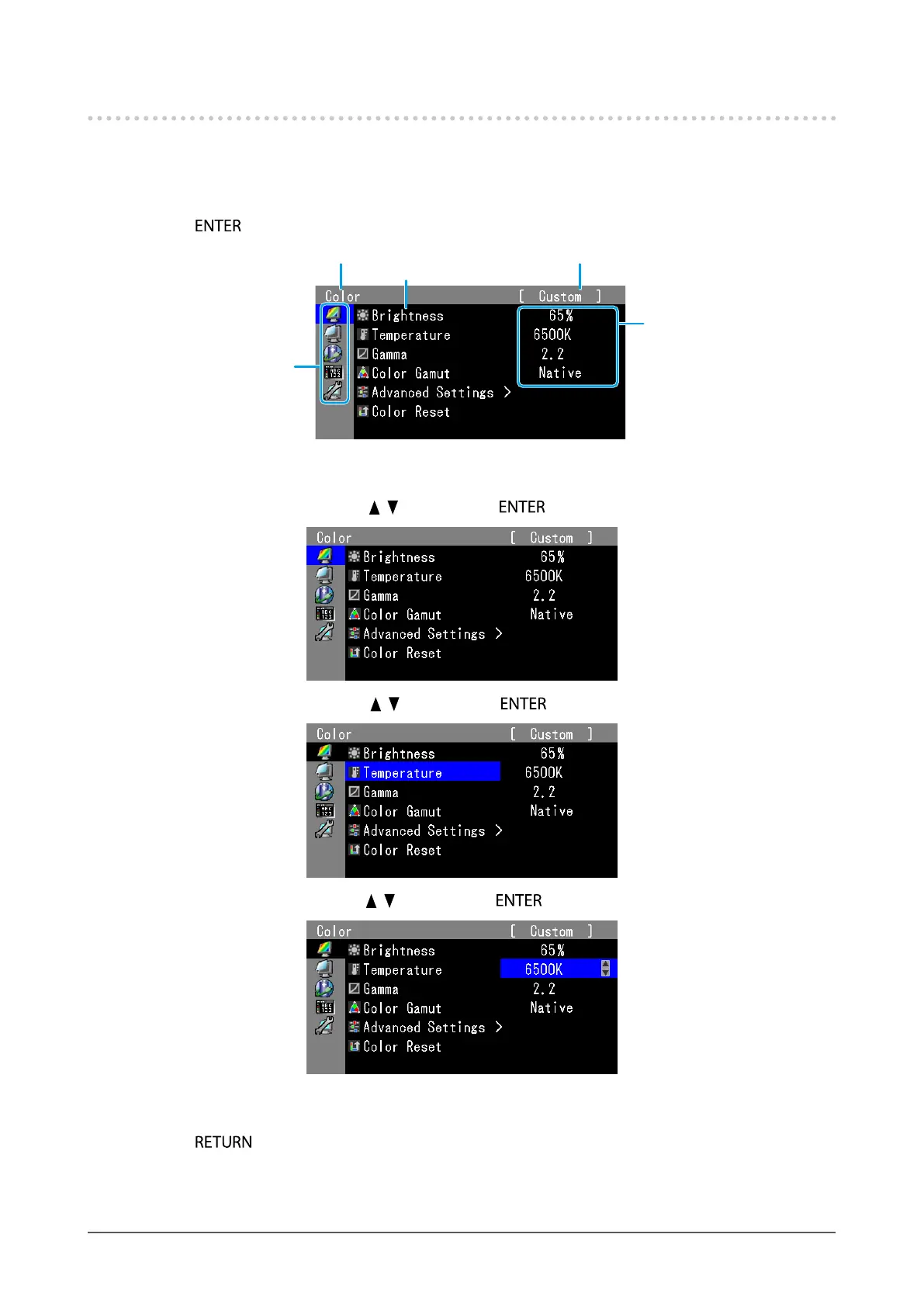 3. Adjust/set the selected item with , , and then press .