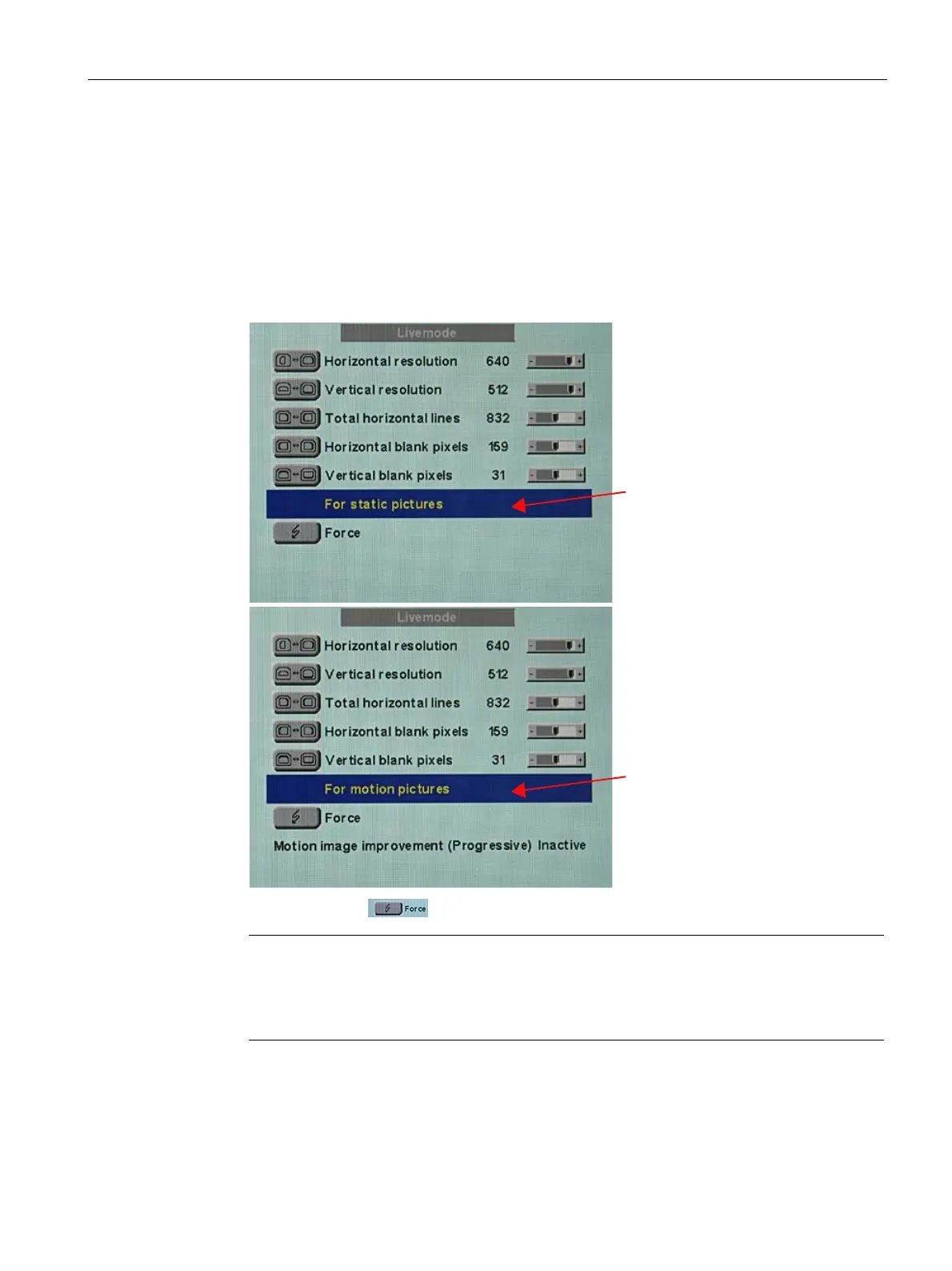 3. Select either "For static pictures" or "For motion pictures" in line 6 in the "Live mode"