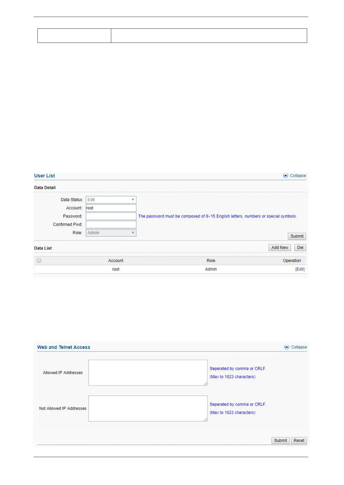 right of permissions. Role “admin” has the highest right of permission, role can be added in page