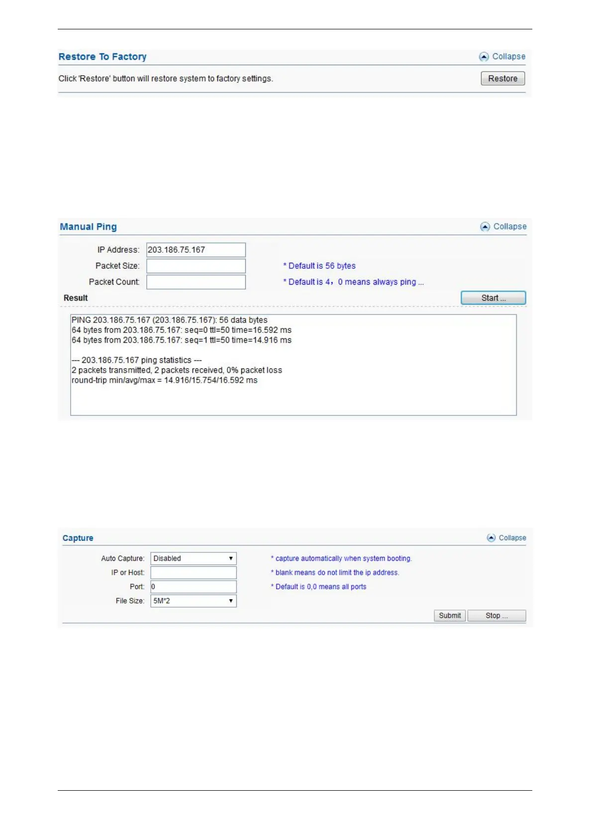 Capture the tcpdump log of device, the log will show in “file management”