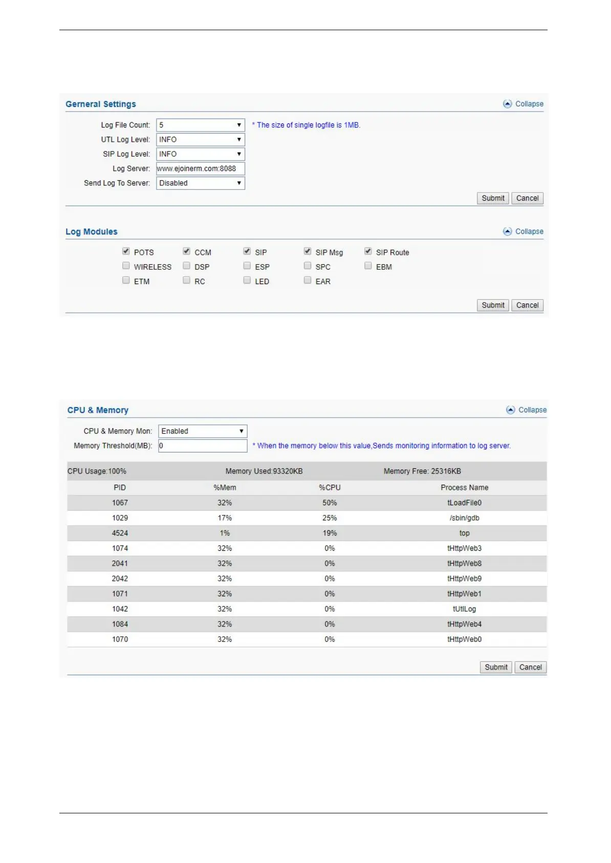 This page is used to show all the running processes of the device, CPU&Memory useage.