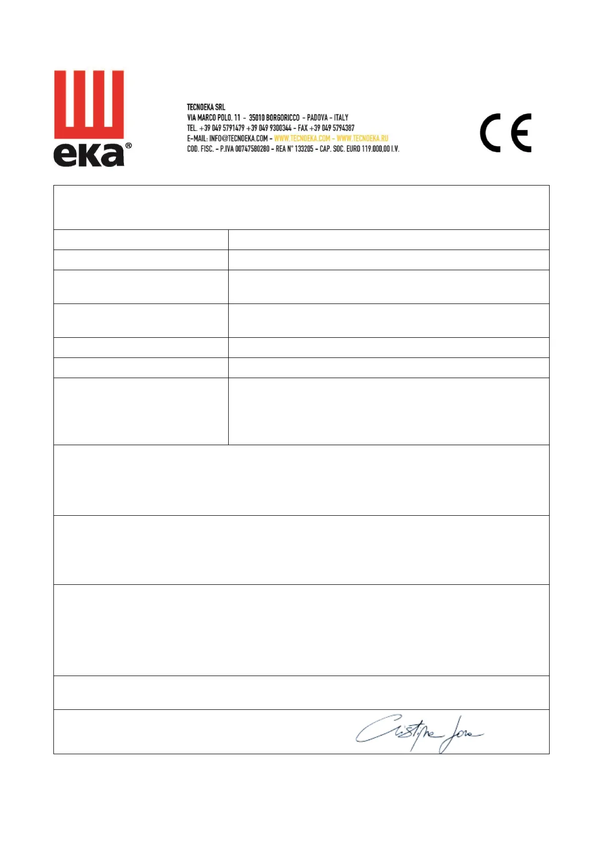 TECNOEKA Srl declares that the above mentioned products comply with all provisions