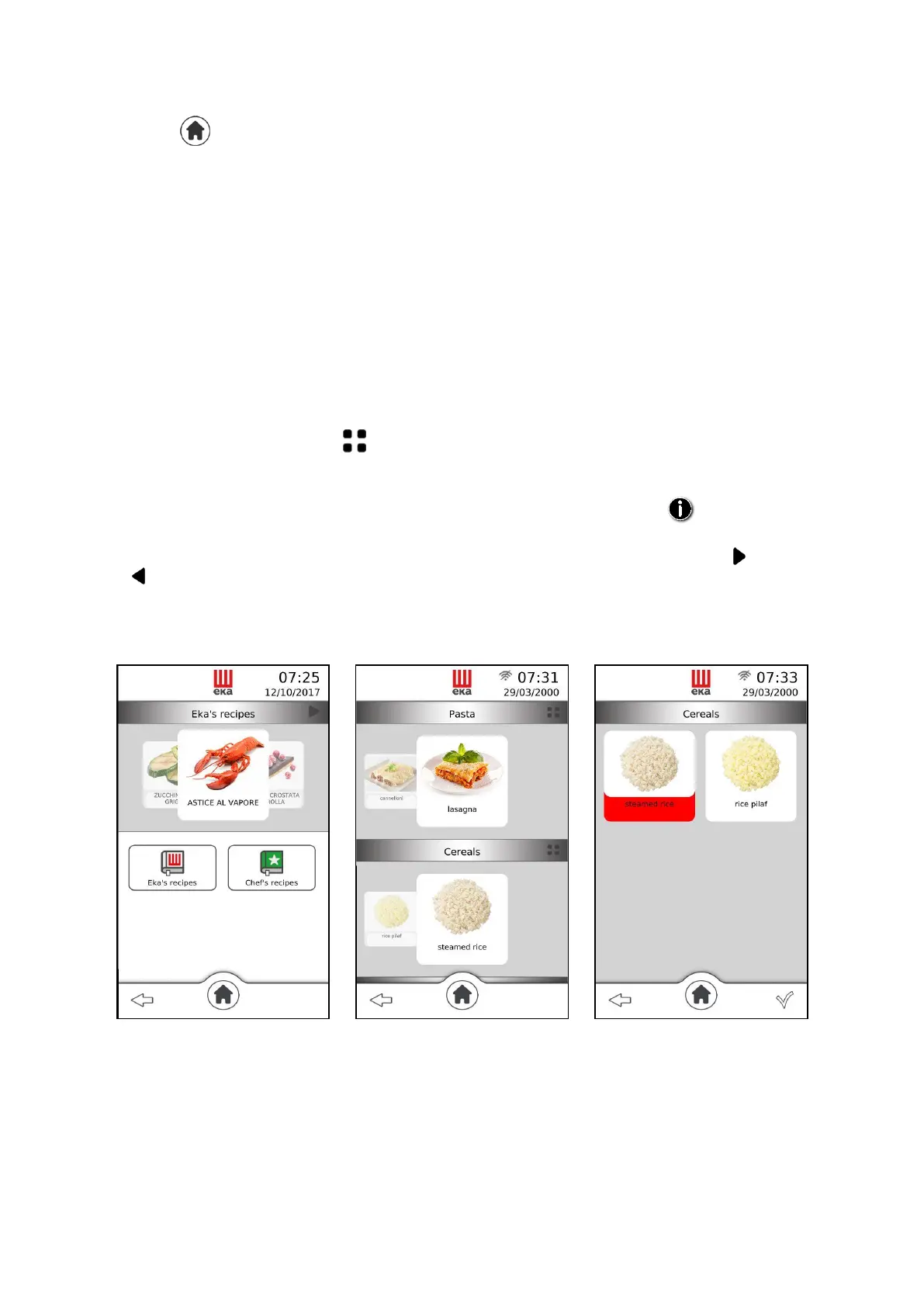 All “Eka Recipes” are already available in the “Home” screen: by repeatedly touching the “ ” symbol
