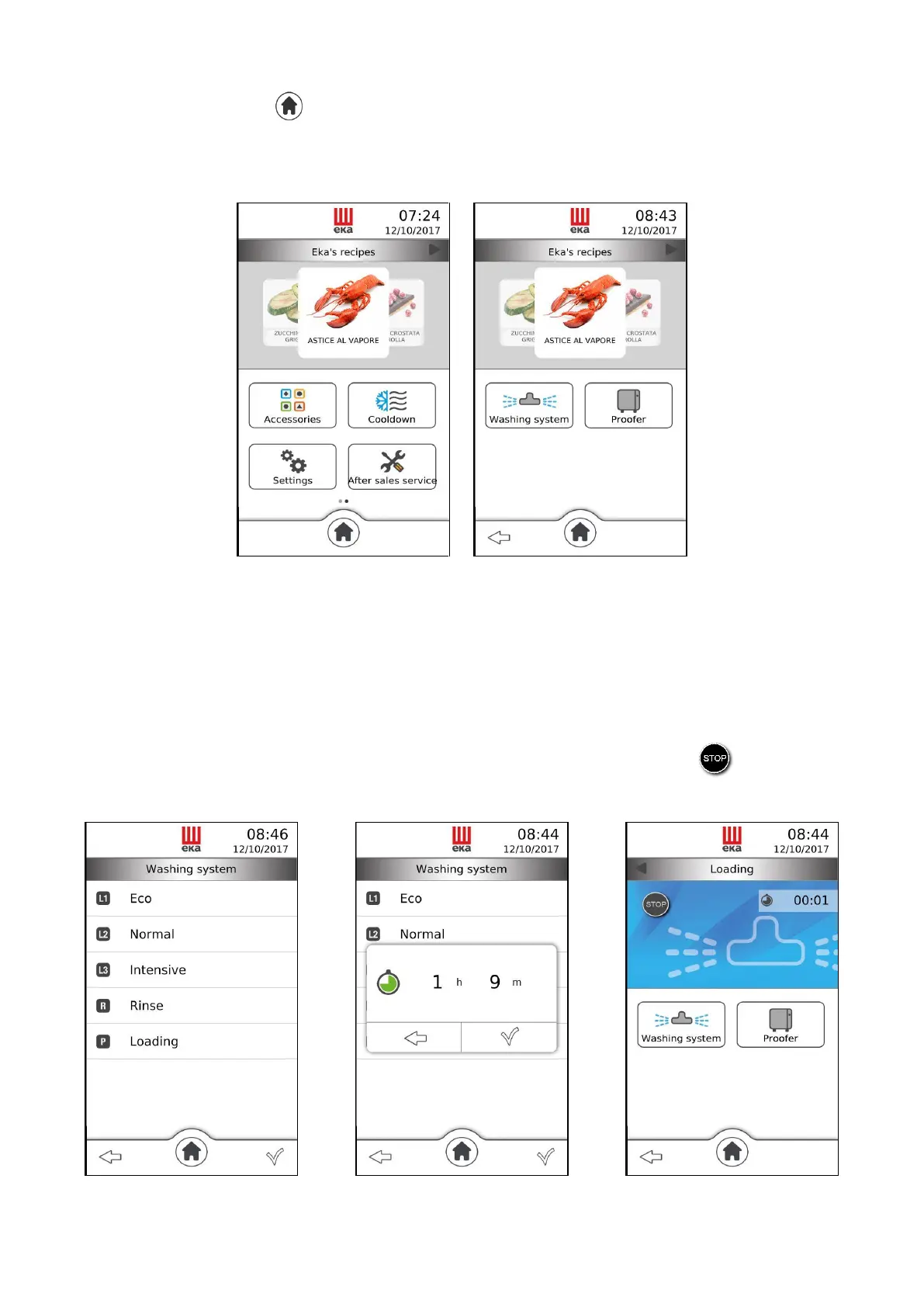 Touching the “Washing” icon displays the screen with the modes available (Fig. 35):