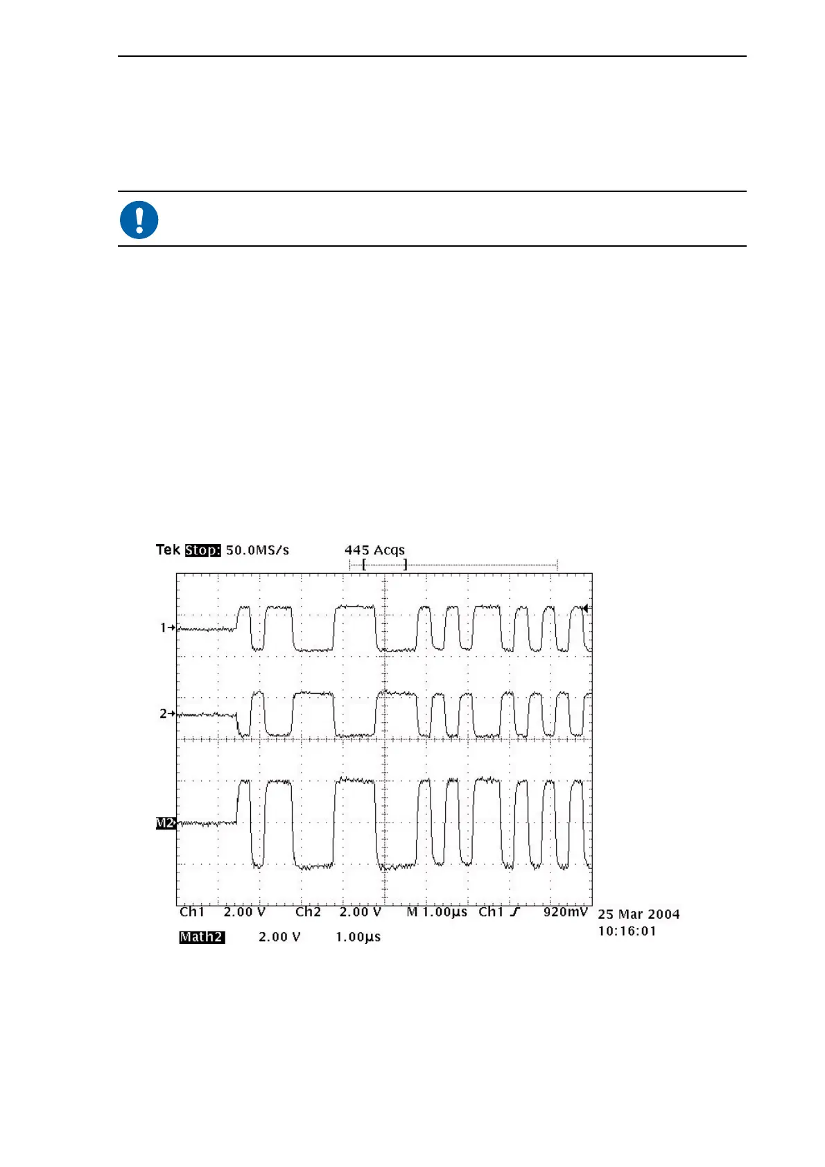 4 Set the oscilloscope for a differential measurement (channel 1 - channel 2) and