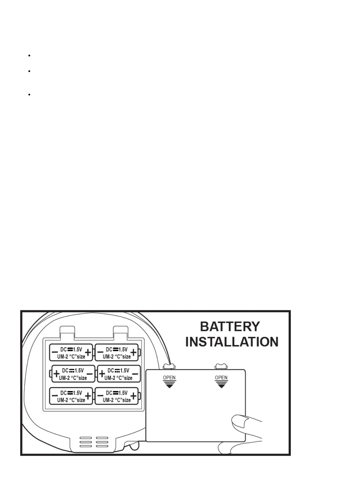 Open the BATTERY COMPARTMENT DOOR. Install 6 pcs UM-2/C size batteries (not included) into compartment.