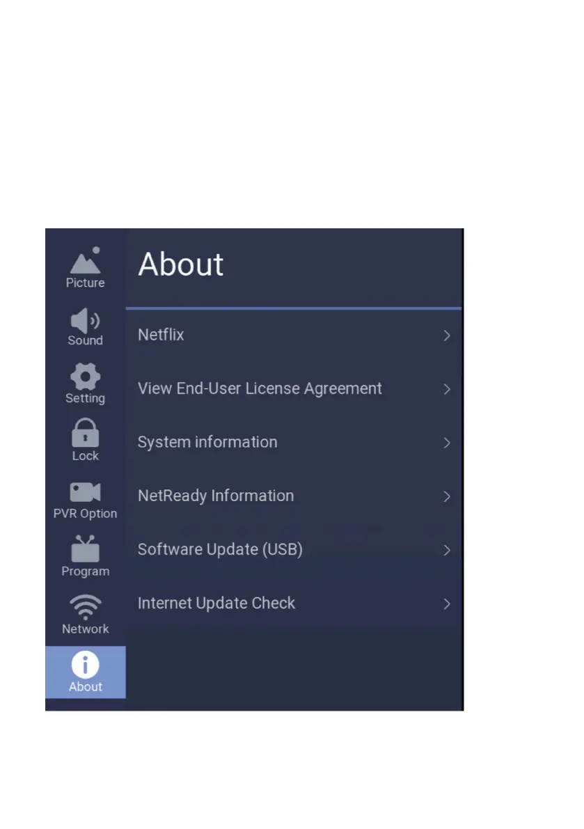 To access About settings, press the MENU on your remote control, go to ABOUT.
