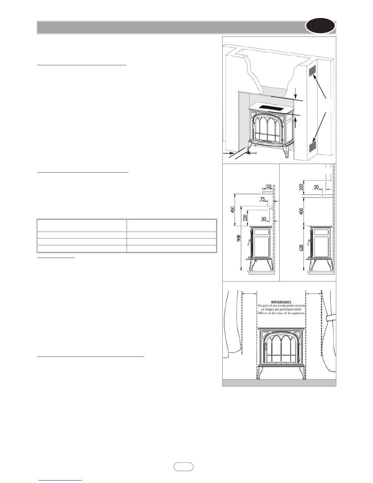 bustible shelf or wooden fire surround are to be sited in proximity to the stove the