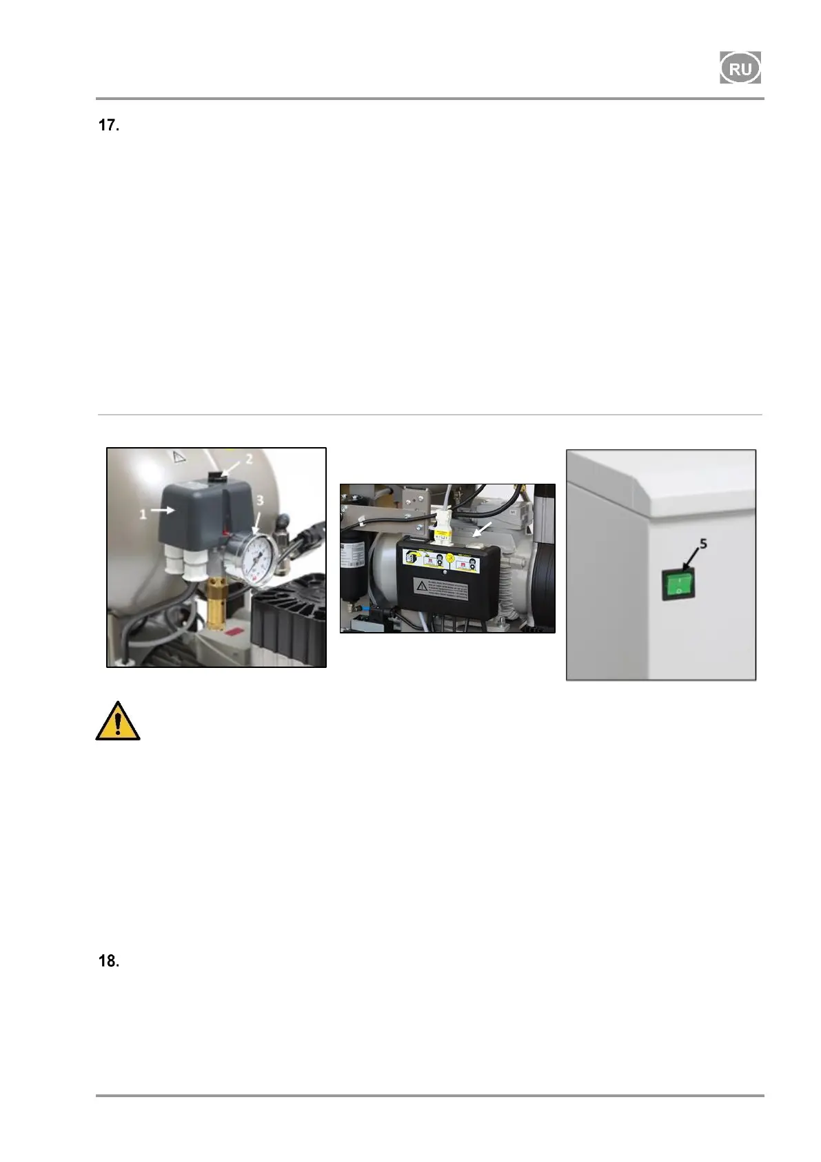 Запустите компрессор (без шкафа), повернув переключатель (2) на реле давления (1) в