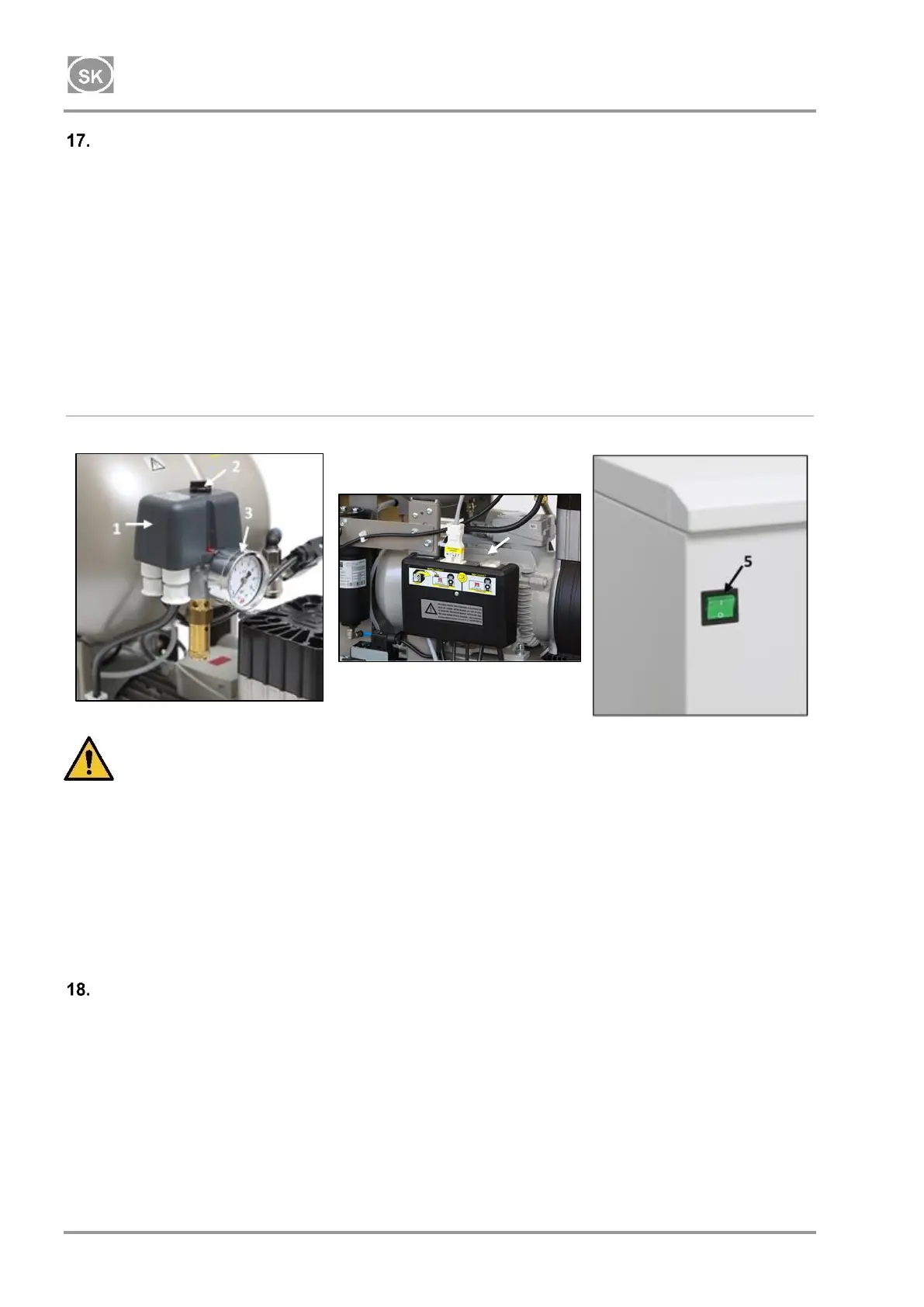 Kompresor v skrinke DK50-10S/M 8-10bar zapnúť vypínačom (5) na prednej strane skrinky,