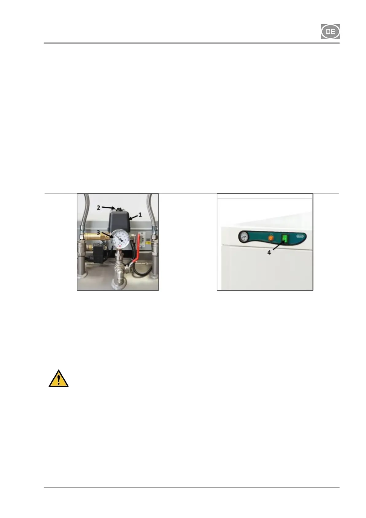 Überprüfen Sie die Werte des Ein- und Ausschaltdrucks mithilfe des Druckmessers (3). Eine