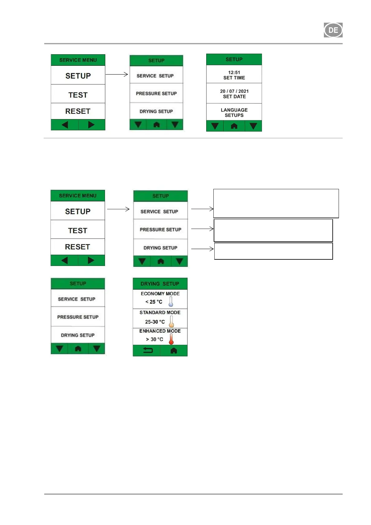 Trocknungsmodus eingestellt sind. Vom Startbildschirm aus kann auf vier Hauptbildschirme