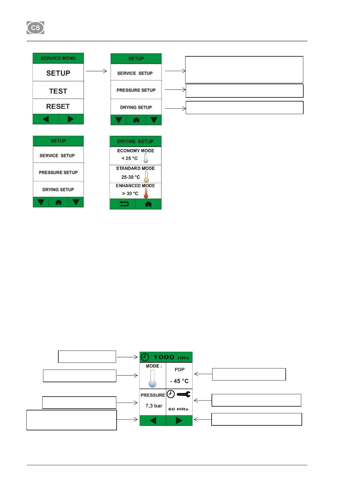 - Na domovské obrazovce sušiče se nacházejí zobrazení základních informací a měřených