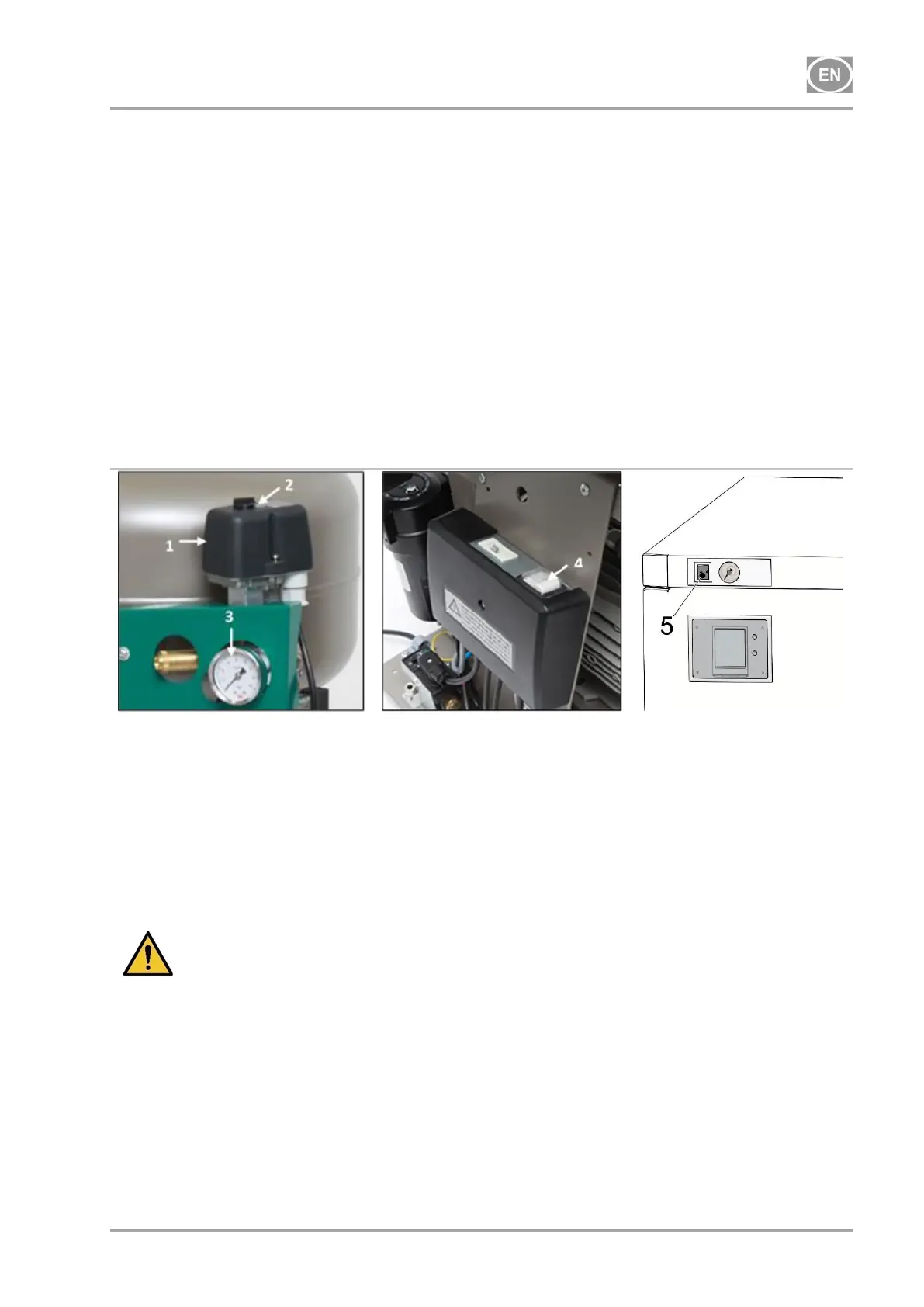 Start the compressor (with a cabinet) at the switch (5) on the front side of the cabinet. This starts
