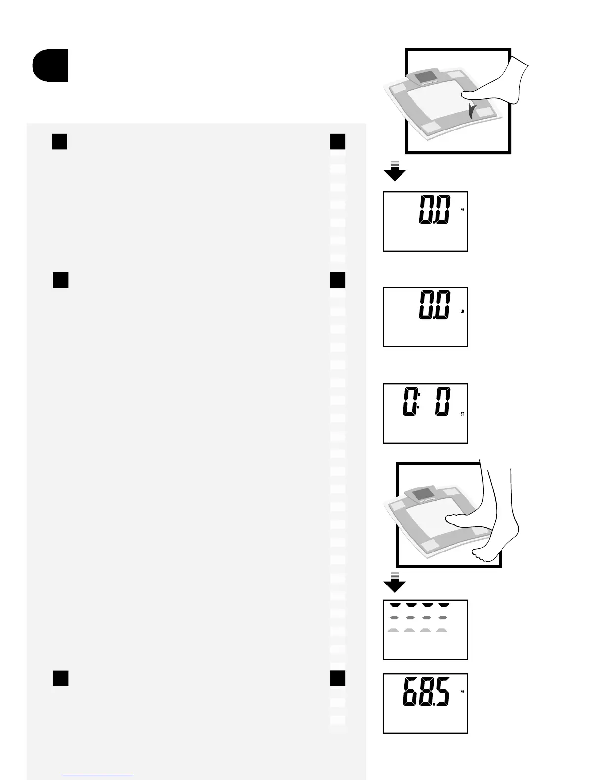 Vänta på “0.0KG” eller “0.0LB” eller “0: 0ST” i displayen