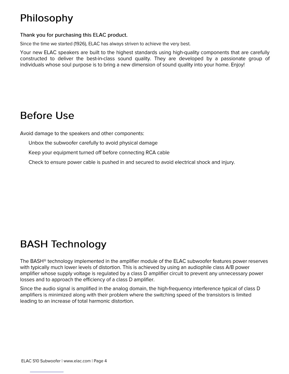 ELAC S10 - Product Philosophy; Pre-Use Setup and Safety; Handling and Connection Precautions; BASH Amplifier Technology