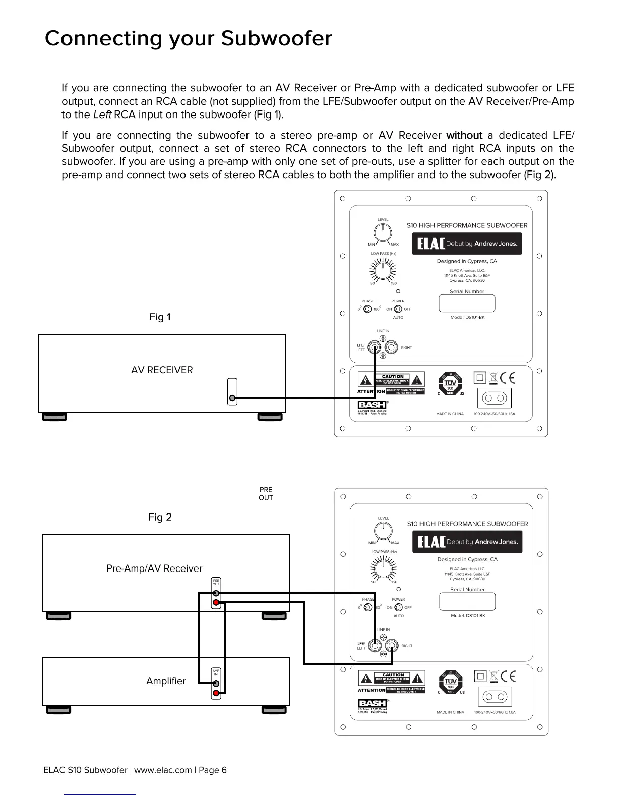 ELAC S10 - Subwoofer Connection Guide; Connecting to AV Receiver with LFE;Subwoofer Out; Connecting to Stereo Pre-Amp;AV Receiver without LFE