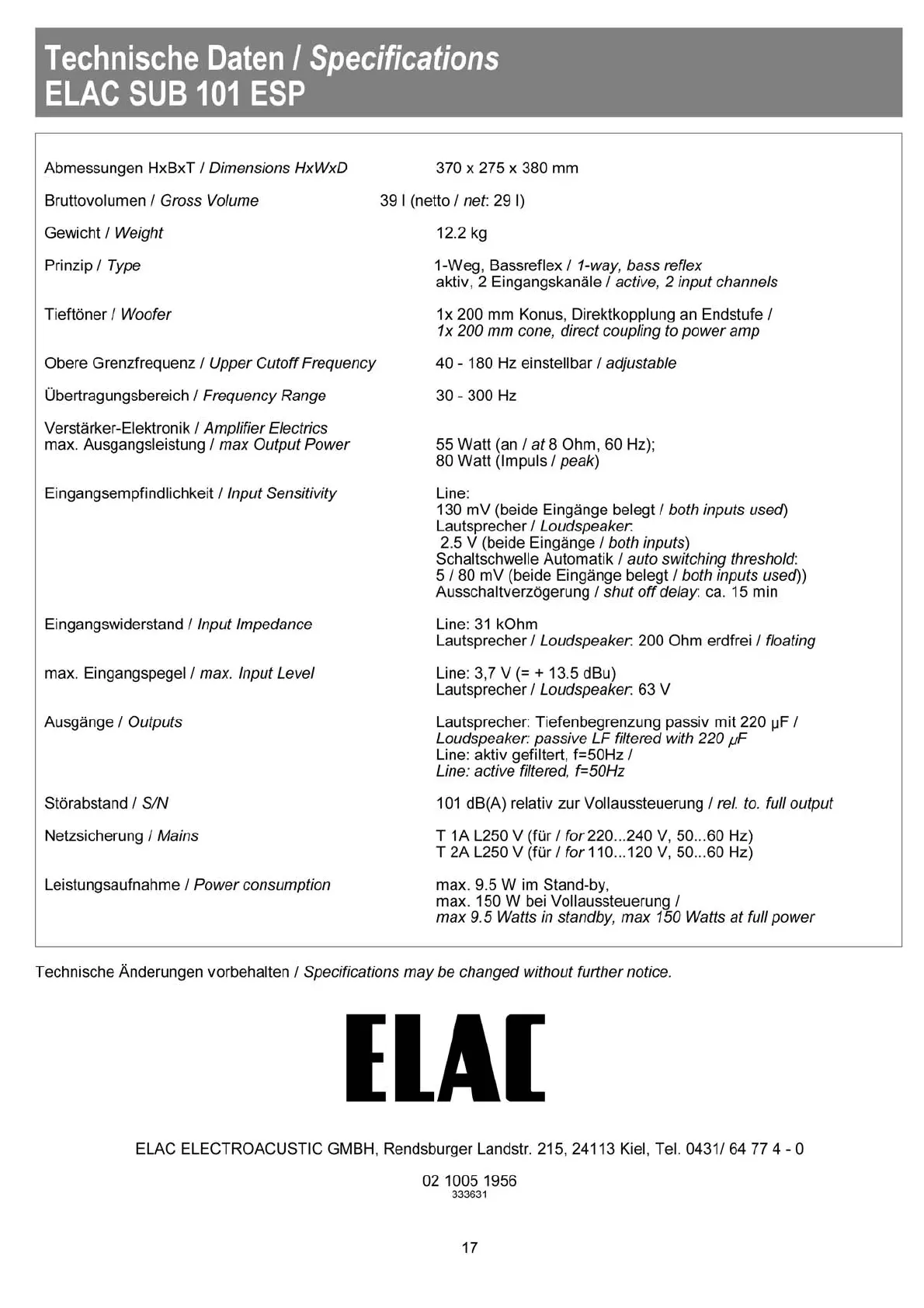 ELAC SUB 101 ESP - Specifications Specifications