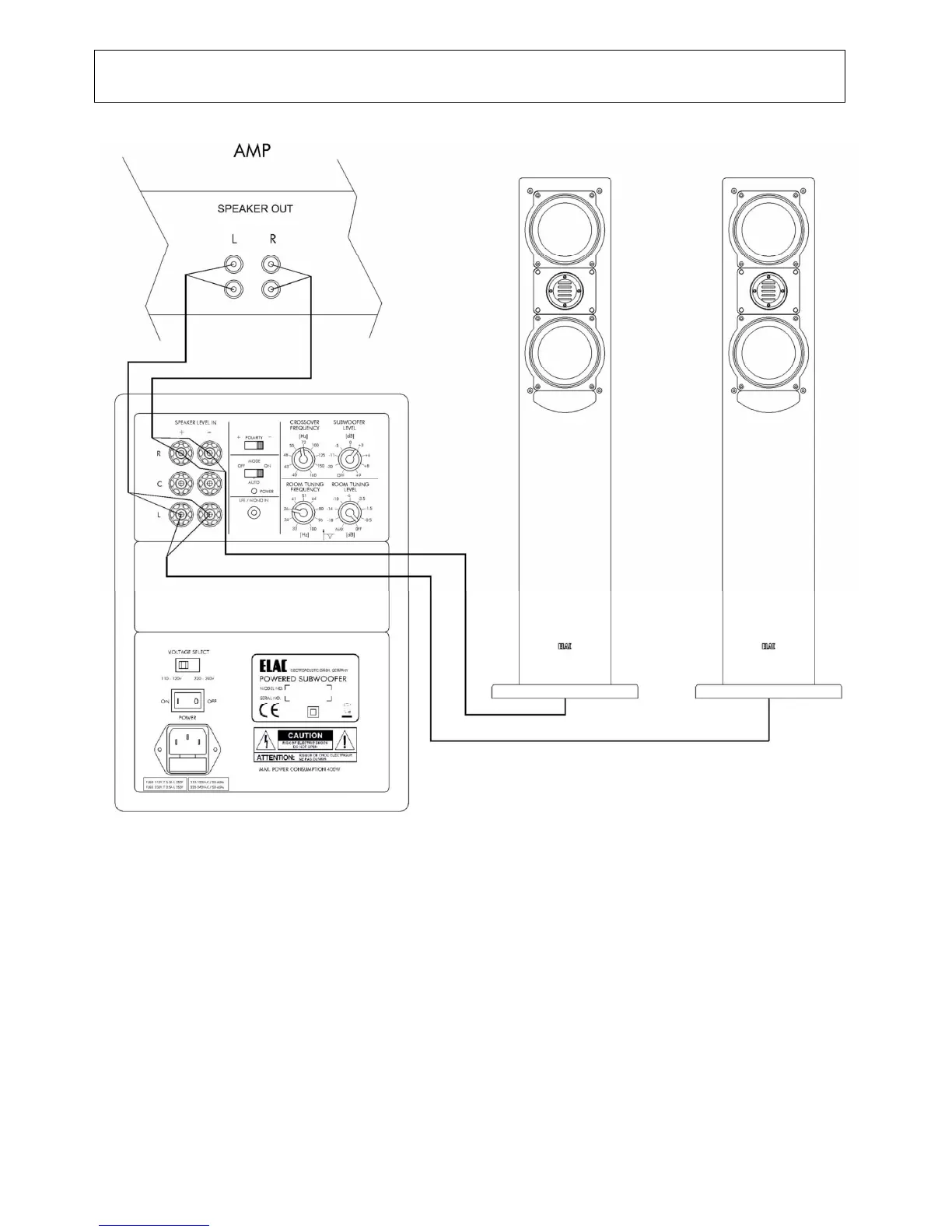 In this example stereo loudspeakers receive the full frequency signal directly from the amplifier, with the subwoofer