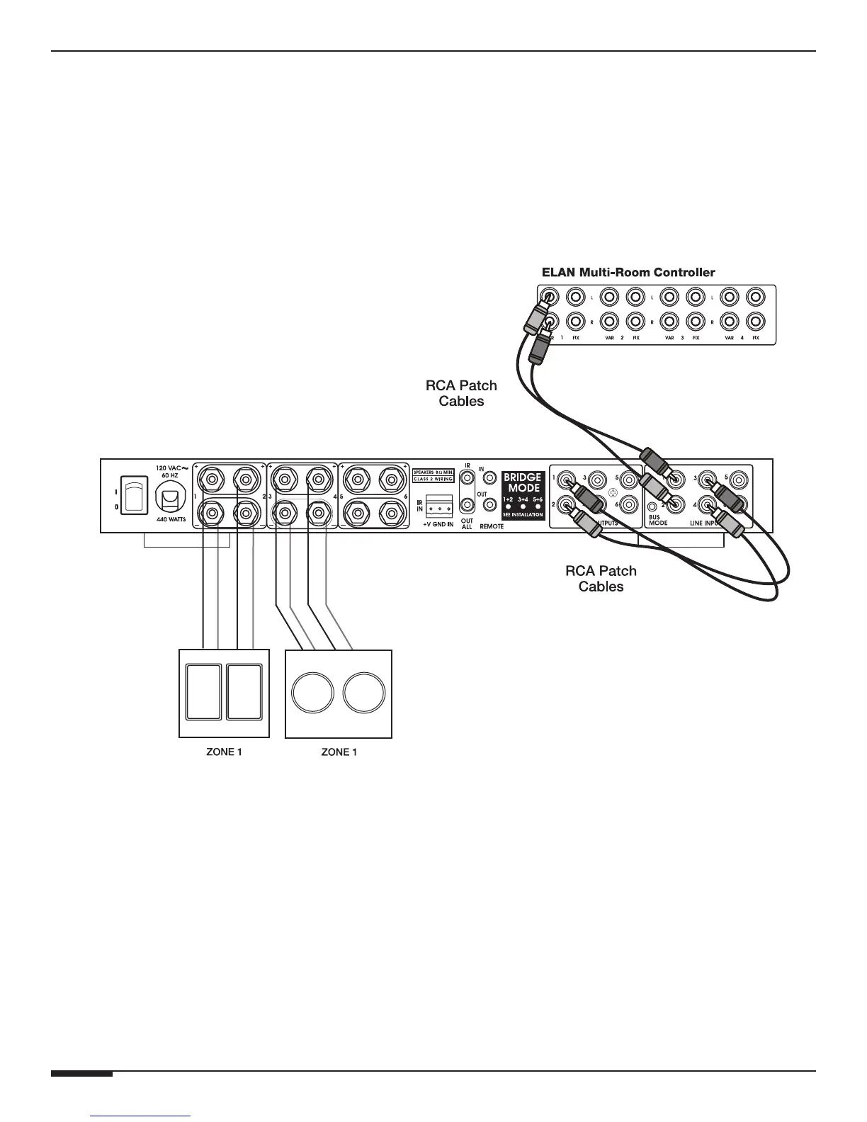By using the A6’s Buffered Line Outputs, an additional pair of speakers can be added to a zone. In this example,