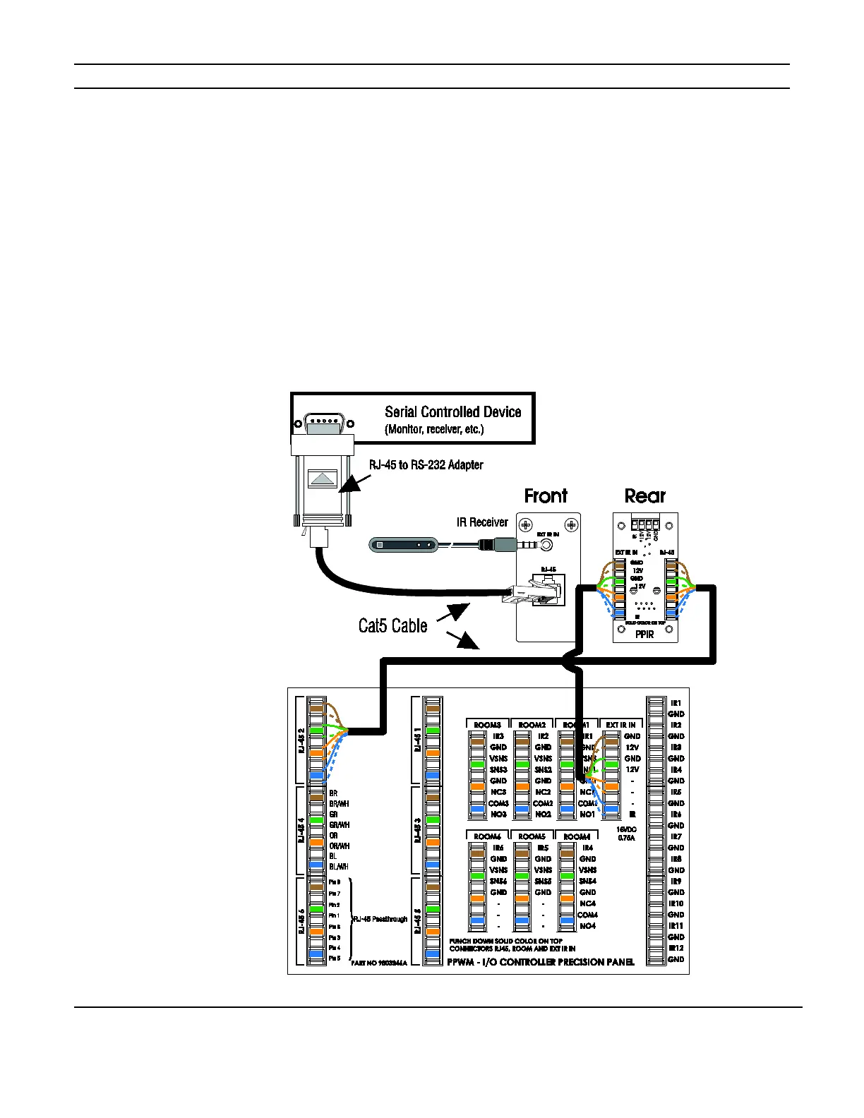 Use Cat5 to connect the Ext IR INpunch-down on the rear of the PPIR to the EXT IR IN