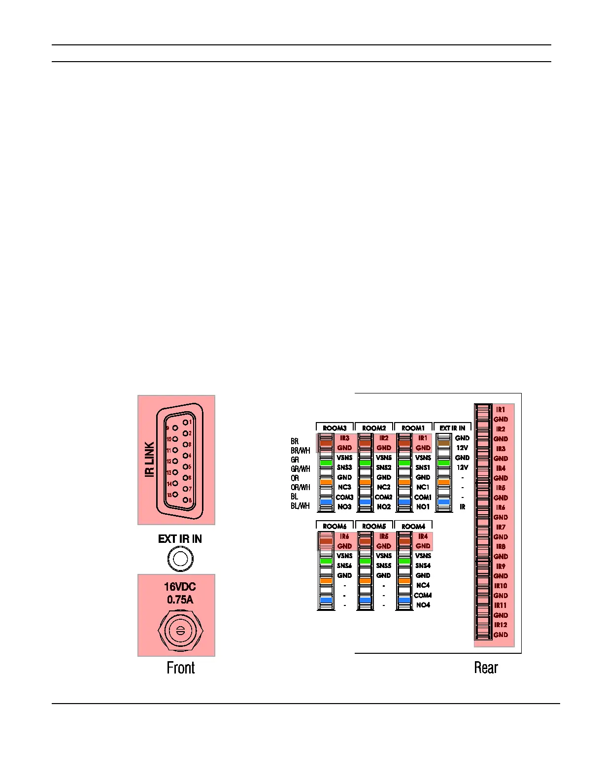 down IR connections. IR “1” sends IR to Room 1, IR “2” sends IR to Room 2, etc. The six