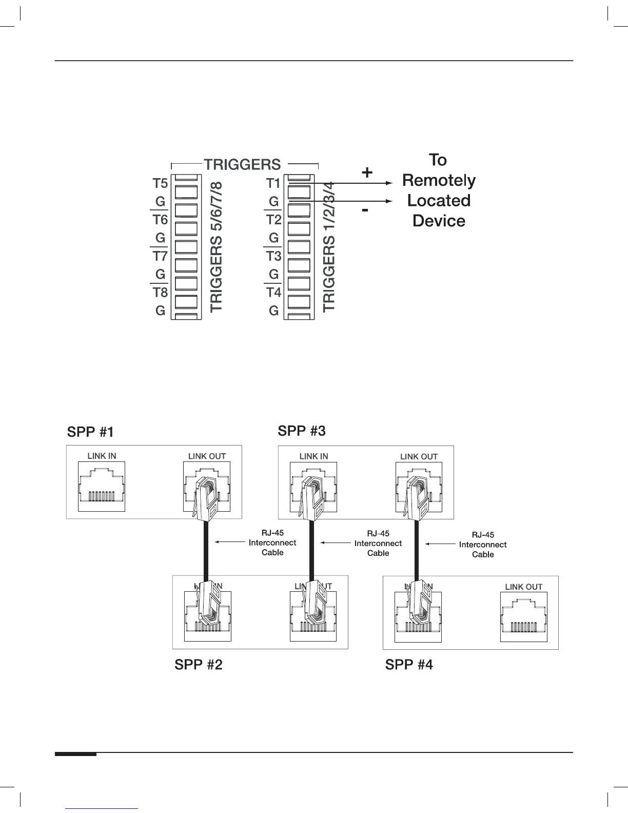 Use an RJ-45 to RJ-45 Interconnect cable from the LINK IN jack of the first SPP Panel to the LINK IN jack of the